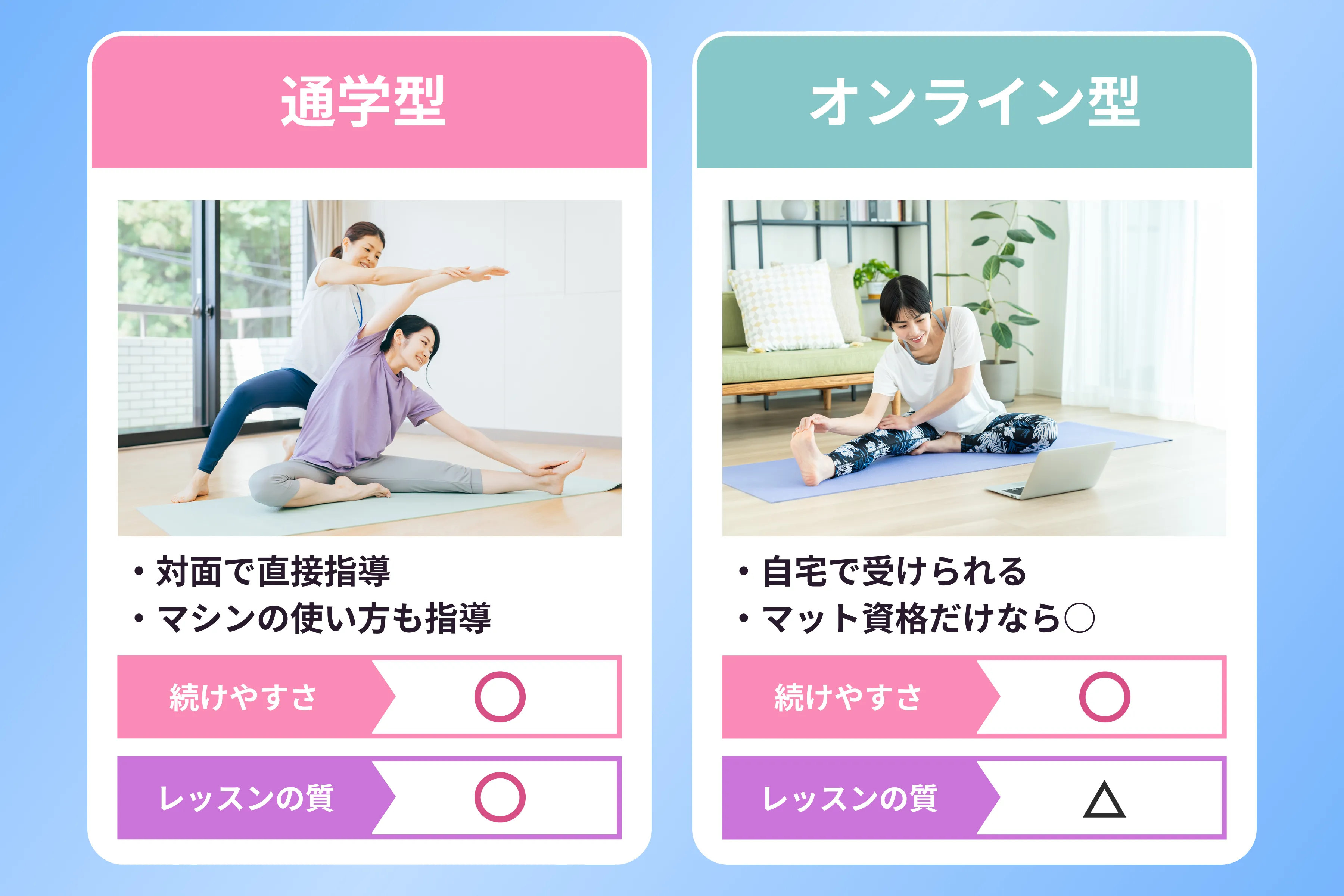 と、自分のペースでしっかり学べます。特にリフォーマーなど自宅に置きにくい器具は、スクールでどれだけ使えるかの確認が必須です。
